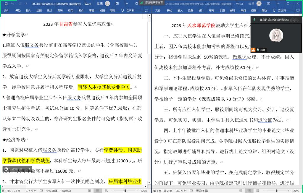“携笔从戎 无上光荣”,为激发公司员工报效祖国、应征入伍的热情,帮助老员工了解、掌握应征入伍相关政策,营造应征光荣的浓厚氛围。2023年4月21日,taptap客服中心举办了2023年下半年老员工应征入伍政策解读宣讲会。宣讲会通过线上线下相结合的方式召开,会议由公司分管征兵工作的辅导员赵媛老师主持,公司26个班级的班长、团支书、大数据专业员工及公司有应征入伍意愿的员工参加了会议。